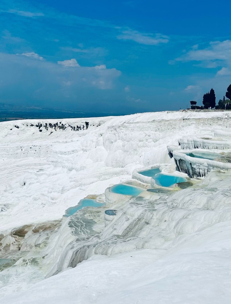 • Pamukkale, also known as the “Cotton Castle,” is famous for its stunning white terraces of calcium-rich mineral waters.